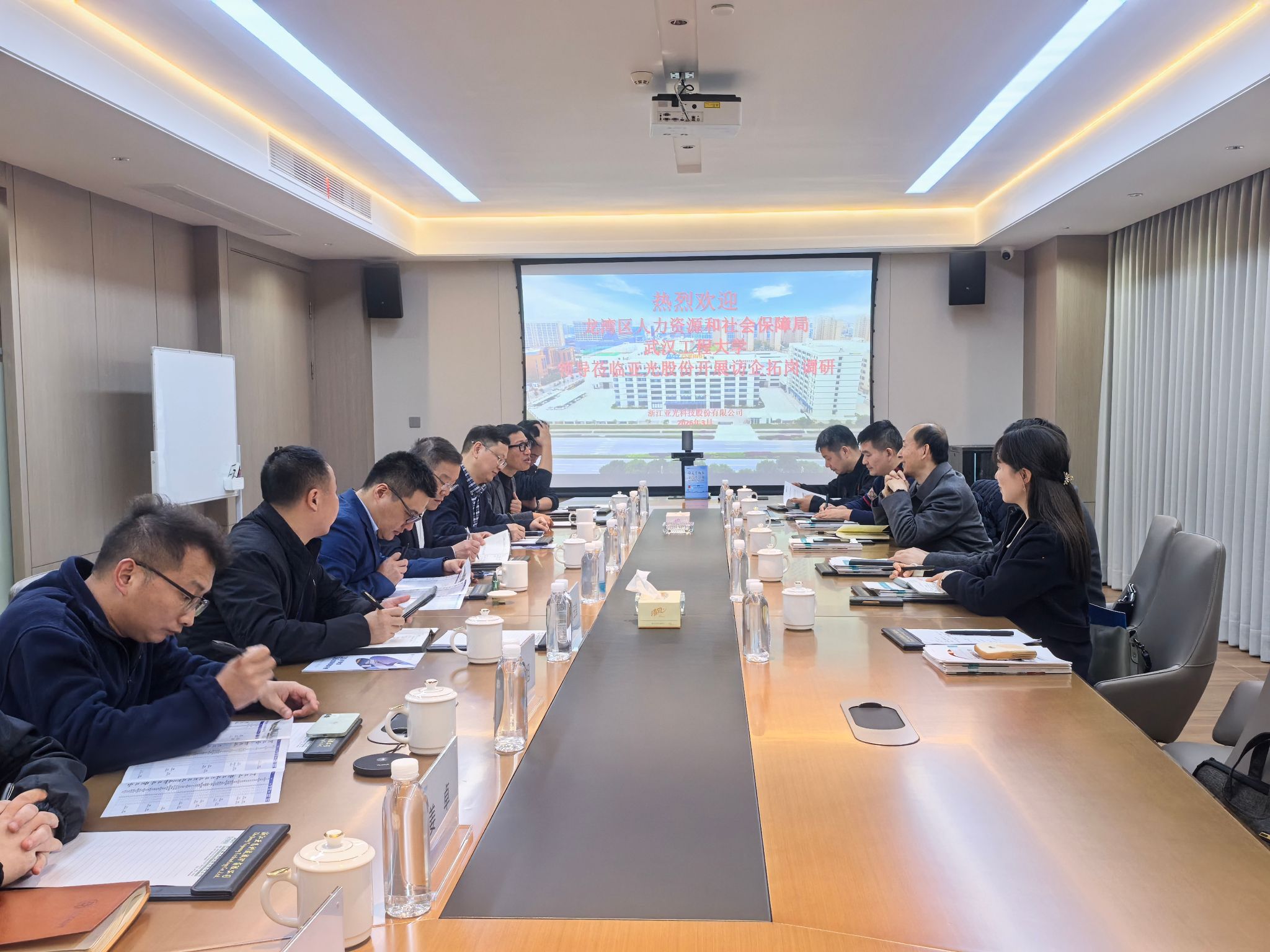 走访结束后,调研组与龙湾区人社局相关负责人举行了座谈会。会上,喻发全副校长介绍了武汉工程大学的学科特色、人才培养优势及毕业生情况。龙湾区人社局详细解读了区域产业结构、发展规划及相关人才引进政策。双方围绕如何建立常态化对接机制、搭建精准供需平台、促进毕业生高质量就业等议题进行了务实且富有建设性的交流,并就后续深化政校企合作达成了初步共识。